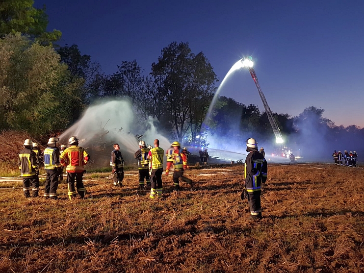 Rund 130 Kräfte von Feuerwehr und THW waren gestern zur Brandbekämpfung Am Feldrain/Stausseestraße im Einsatz. Bei der Umschichtung der Holzstämme ergaben sich Hinweise, dass das Feuer u. U. vorsätzlich gelegt worden sein könnte.