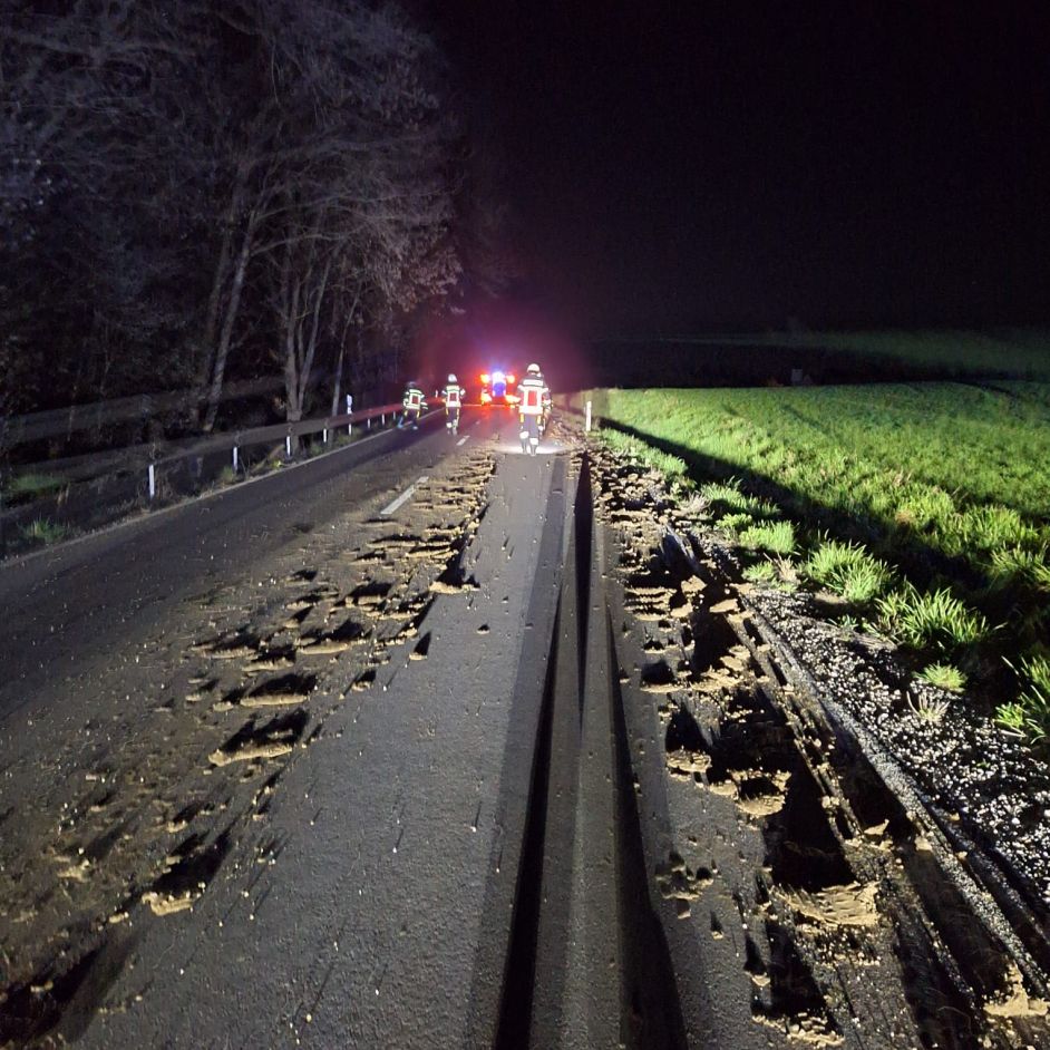 Die Straße war durch den Einsatz von Landwirtschaftlichen Fahrzeugen stark verschmutzt worden und stellte eine Gefahr für jeden Verkehrsteilnehmer dar.