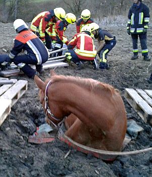 Da für schweres Gerät wie Teleskoplader oder Rückewägen auf Grund des schlammigen Untergrundes keine Zufahrt zur Einsatzstelle bestand, mussten Paletten, Schalungstafeln und Gummimatten zur Sicherstellung eines festen Standes für das Tierhebegerät von Hand mehrere hundert Meter durch schlammiges Gelände getragen werden. Mit diesen Materialien konnte schließlich eine Plattform für das “Vierbein” errichtet werden, an dessen Spitze wiederum der Flaschenzug zum Anheben des Pferdes montiert wurde.