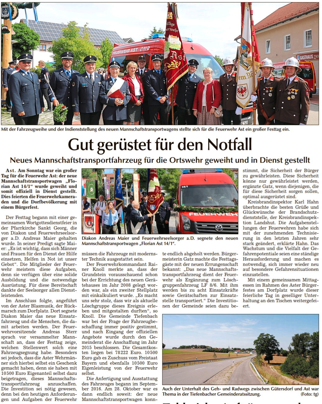 Ast. Am Sonntag war ein großer Tag für die Feuerwehr Ast: der neue Mannschaftstransportwagen „Florian Ast 14/1“ wurde geweiht und somit offiziell in Dienst gestellt. Dies feierten die Feuerwehrkameraden und die Dorfbevölkerung mit einem Bürgerfest.