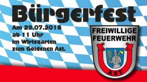 Ast. Am kommenden Sonntag den 29.07.2018 findet wieder das alljährige Bürgerfest der FFW Ast statt. Beginn der Veranstaltung ist ab 11:00 Uhr im Gasthaus zum Goldenen Ast. Für das leibliche Wohl ist bestens gesorgt, für jeden ist etwas dabei. Zur Wahl stehen unter anderem Giggerl, Steckerlfisch, Gegrilltes bis hin zur Gemüsepfanne oder für die Kids Pommes, verhungern muss also niemand. Neben einer Hupfburg gibt es auch eine Tragerlrutsche. Aber genug der Schwärmerei, kemmts vorbei und überzeigts eich selbst. Auf eurer Kommen freut sich die Aster Feuerwehr.